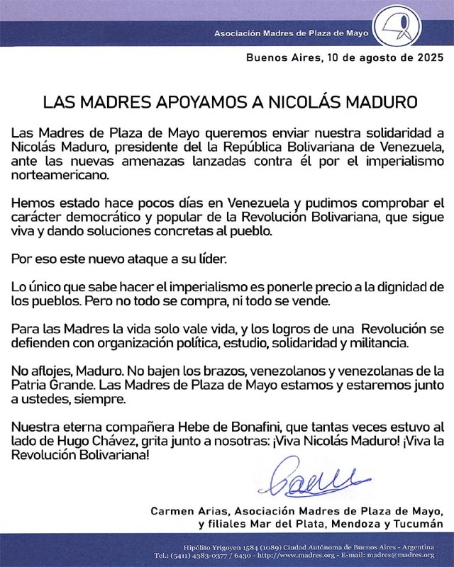 No aflojes, Maduro. No bajen los brazos, venezolanos y venezolanas de la Patria Grande. Las Madres de Plaza de Mayo estamos y estaremos junto a ustedes, siempre.