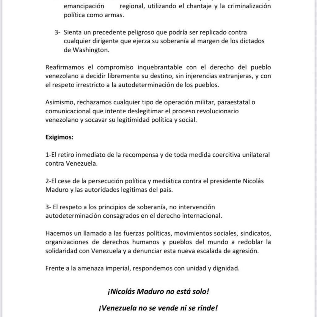 Hacemos un llamado a las fuerzas políticas, movimientos sociales, sindicatos, organizaciones de derechos humanos y pueblos del mundo a redoblar la solidaridad con Venezuela y a denunciar esta nueva escalada de agresión.