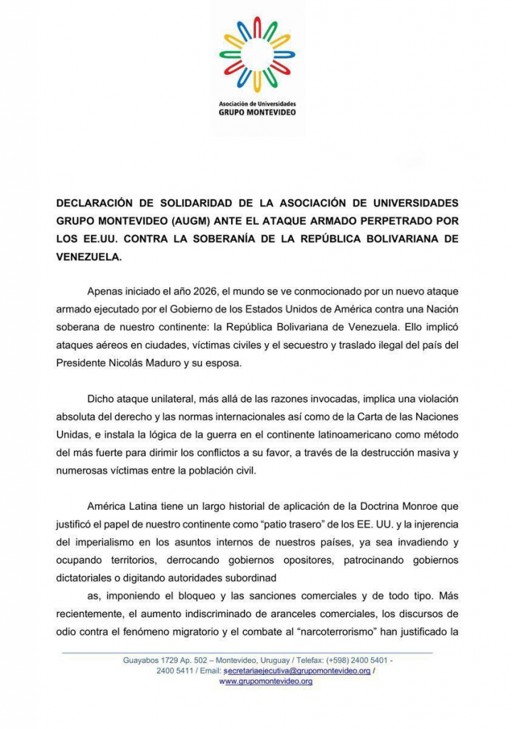 La Asociación de Universidades Grupo Montevideo (AUGM) emitió una firme declaración de solidaridad en rechazo al ataque armado perpetrado por el Gobierno de los Estados Unidos (EE. UU.) contra la República Bolivariana de Venezuela el pasado 3 de enero.