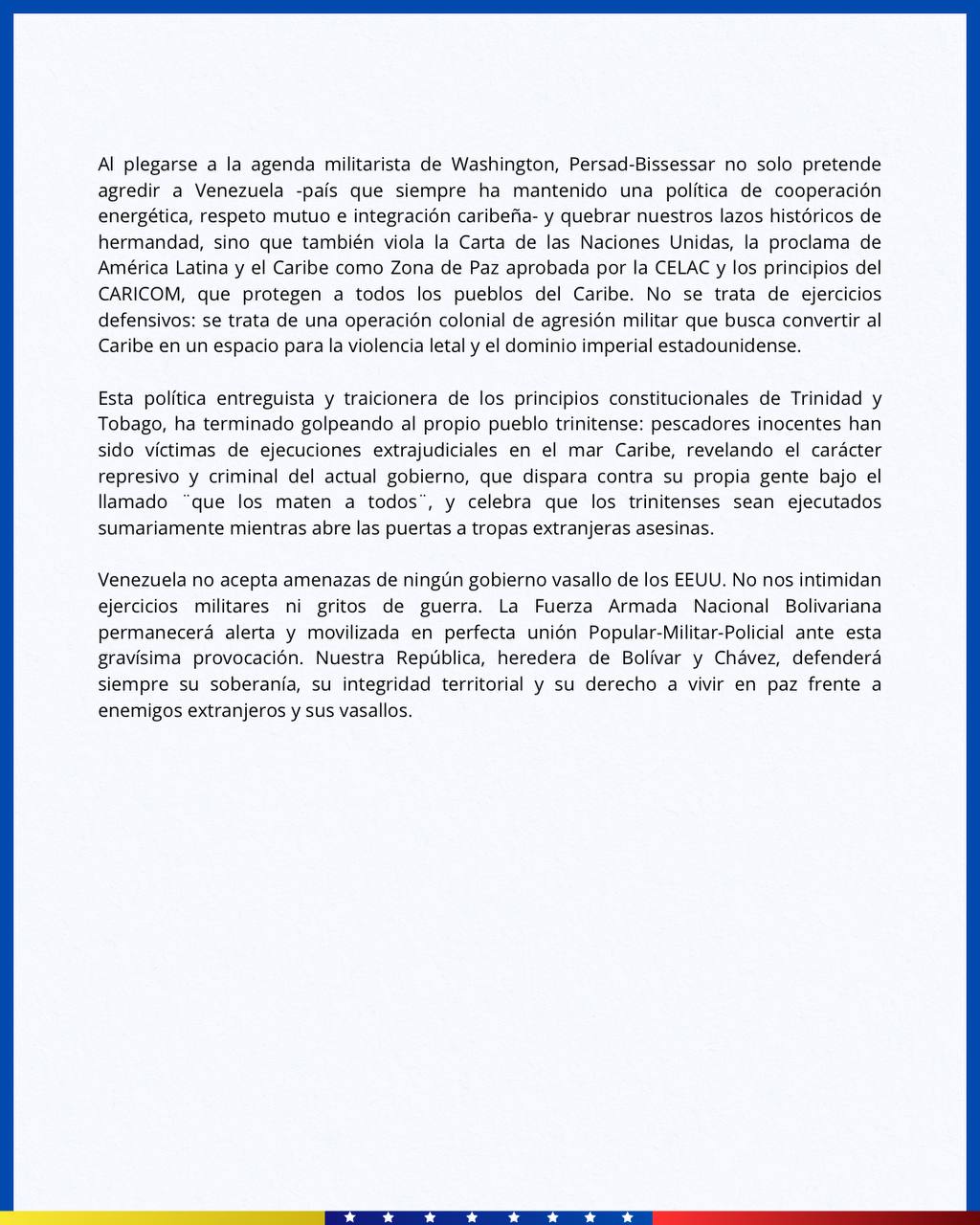 Asimismo, manifestó que ante tales acciones «Venezuela continuará instando a todo el sistema de Naciones Unidas a utilizar todas las capacidades que los pueblos del mundo le han confiado», con el fin de defender la paz y la soberanía de todas las naciones, especialmente en relación con el decreto de «Zona de Paz» para la región caribeña, declarado en 2014 por la CELAC.