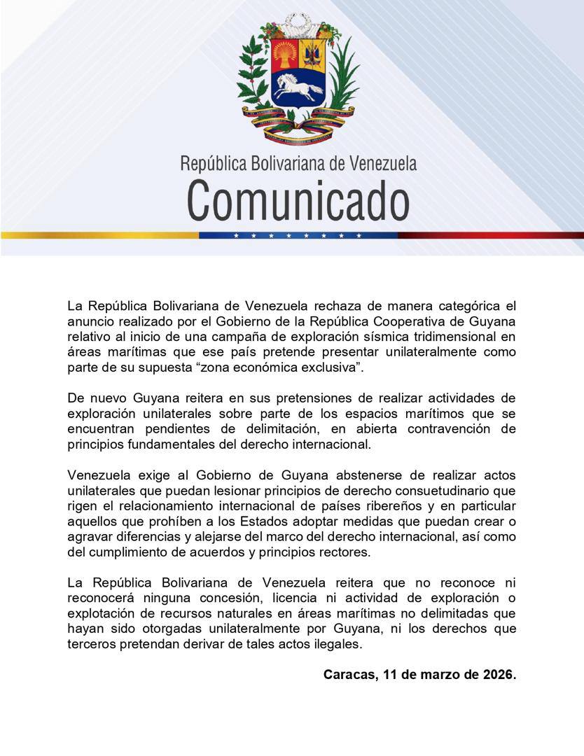 A través de un comunicado oficial publicado el 11 de marzo de 2026, la República Bolivariana de Venezuela a través del Ministro del Poder Popular para las Relaciones Exteriores, manifestó su rechazo ante el reciente anuncio del Gobierno de la República Cooperativa de Guyana sobre el inicio de una campaña de exploración sísmica tridimensional.