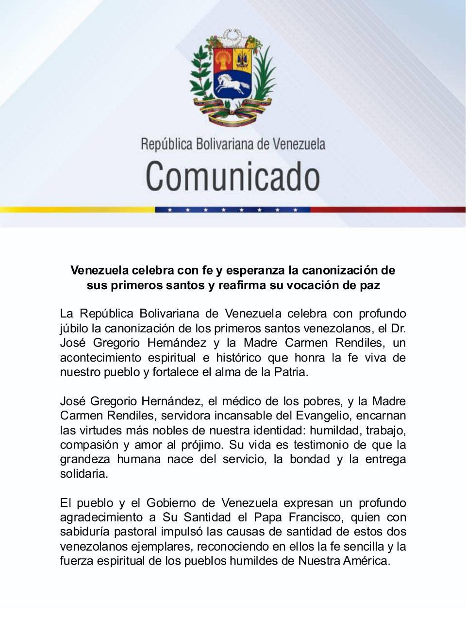Venezuela celebra con fe y esperanza la canonización de sus primeros santos y reafirma su vocación de paz. La República Bolivariana de Venezuela celebra con profundo júbilo la canonización de los primeros santos venezolanos, el Dr. José Gregorio Hernández y la Madre Carmen Rendiles, un acontecimiento espiritual e histórico que honra la fe viva de nuestro pueblo y fortalece el alma de la Patria.